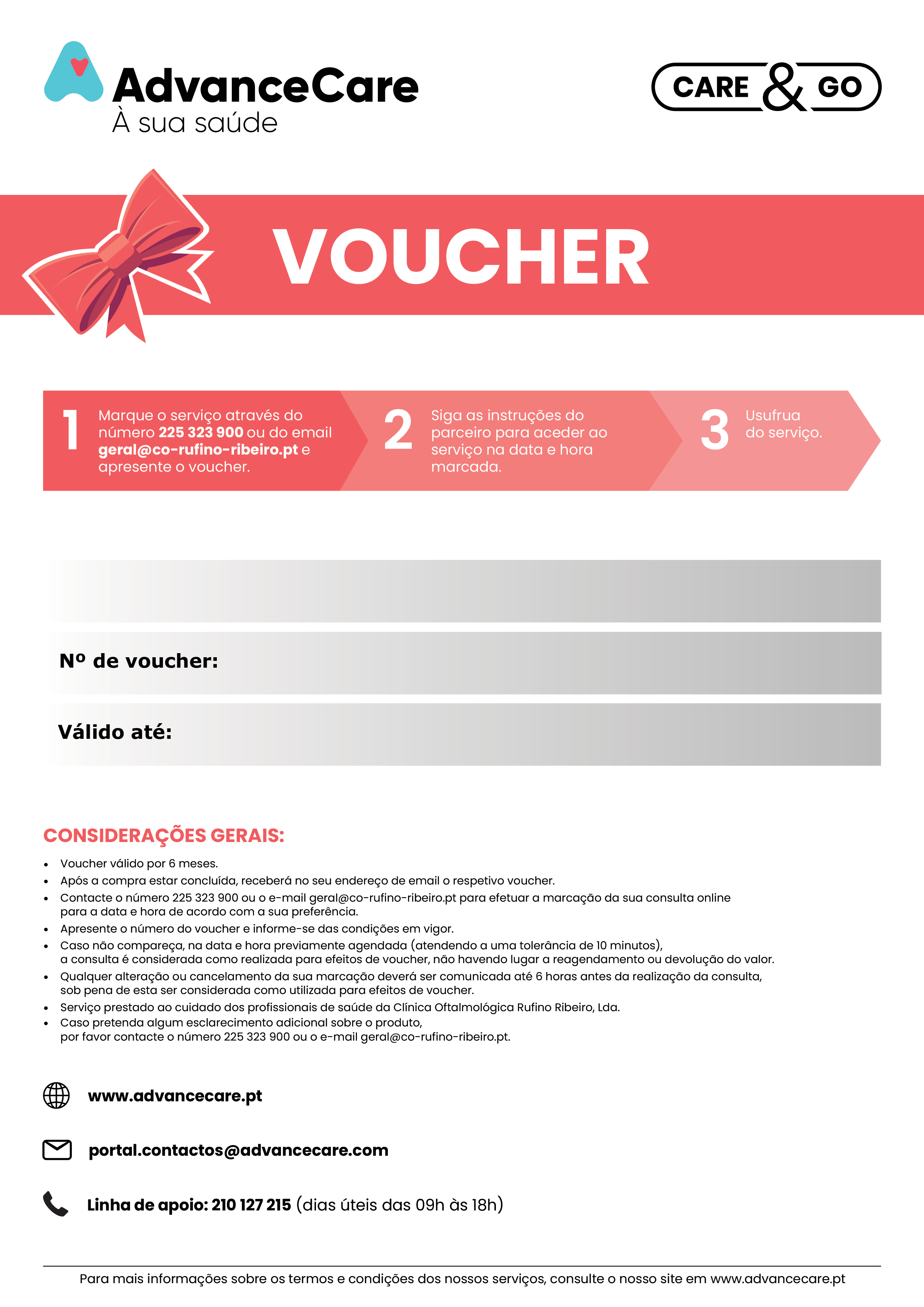 - Contacte o número 225 323 900 ou o e-mail geral@co-rufino-ribeiro.pt para efetuar a marcação da sua consulta para a data e hora de acordo com a sua preferência. Apresente o número do voucher e informe-se das condições em vigor.