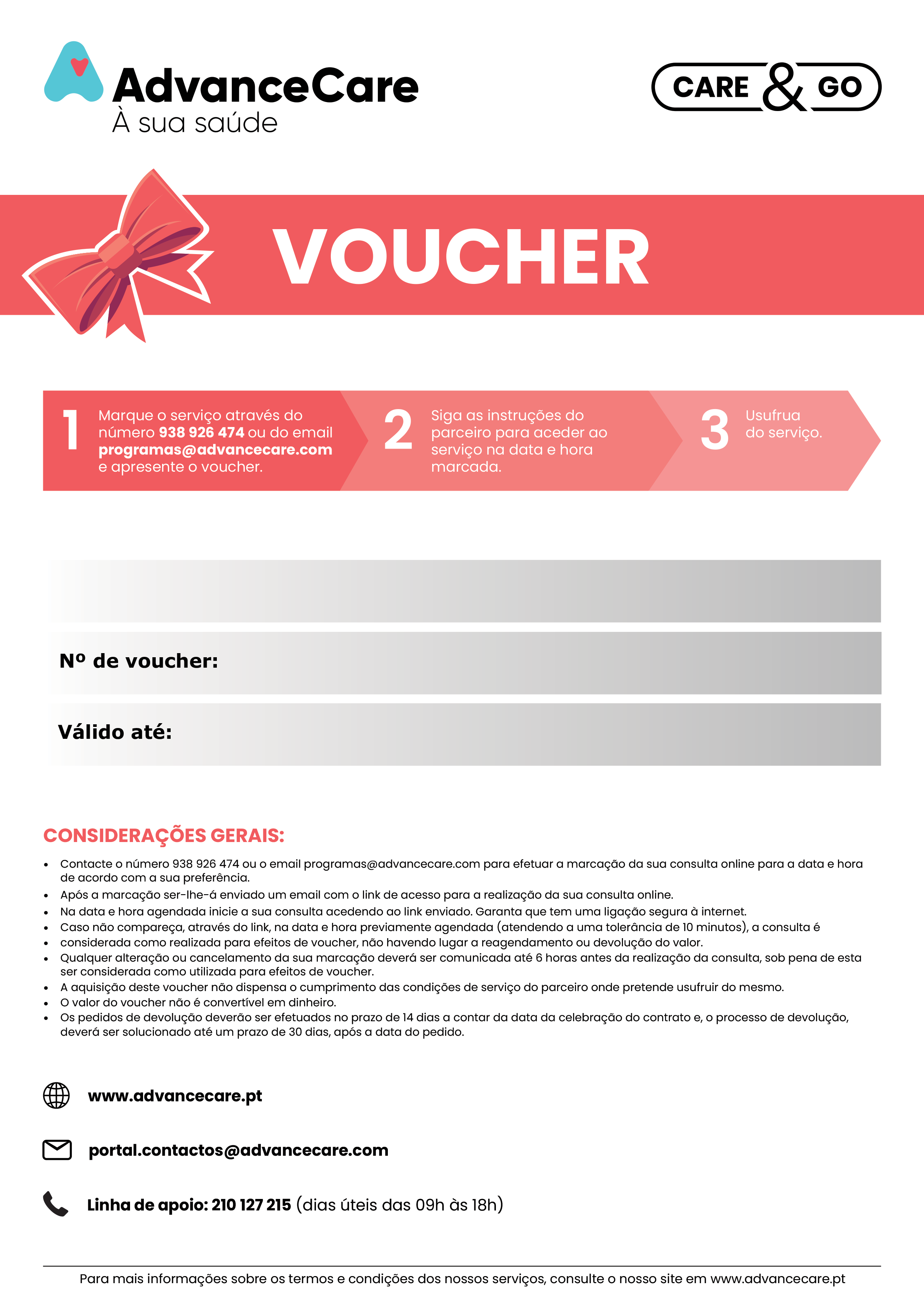 - Contacte o número 938 926 474 ou o e-mail programas@advancecare.com para efetuar a marcação da sua consulta online para a data e hora de acordo com a sua preferência. Apresente o número do voucher e informe-se das condições em vigor.